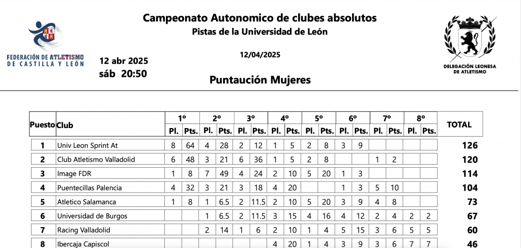 🥇 El equipo femenino se proclamó Campeón Autonómico, logrando una emocionante victoria que se decidió en el relevo 4×400. Con un total de 126 puntos, nuestras atletas superaron al Club Atletismo Valladolid (120 puntos) y al Imagen FDR (114 puntos), en una competición muy reñida hasta el final.