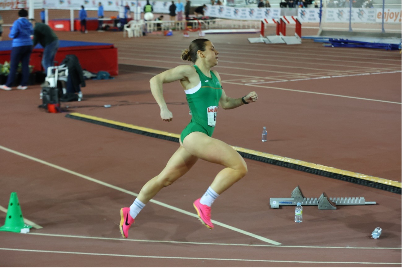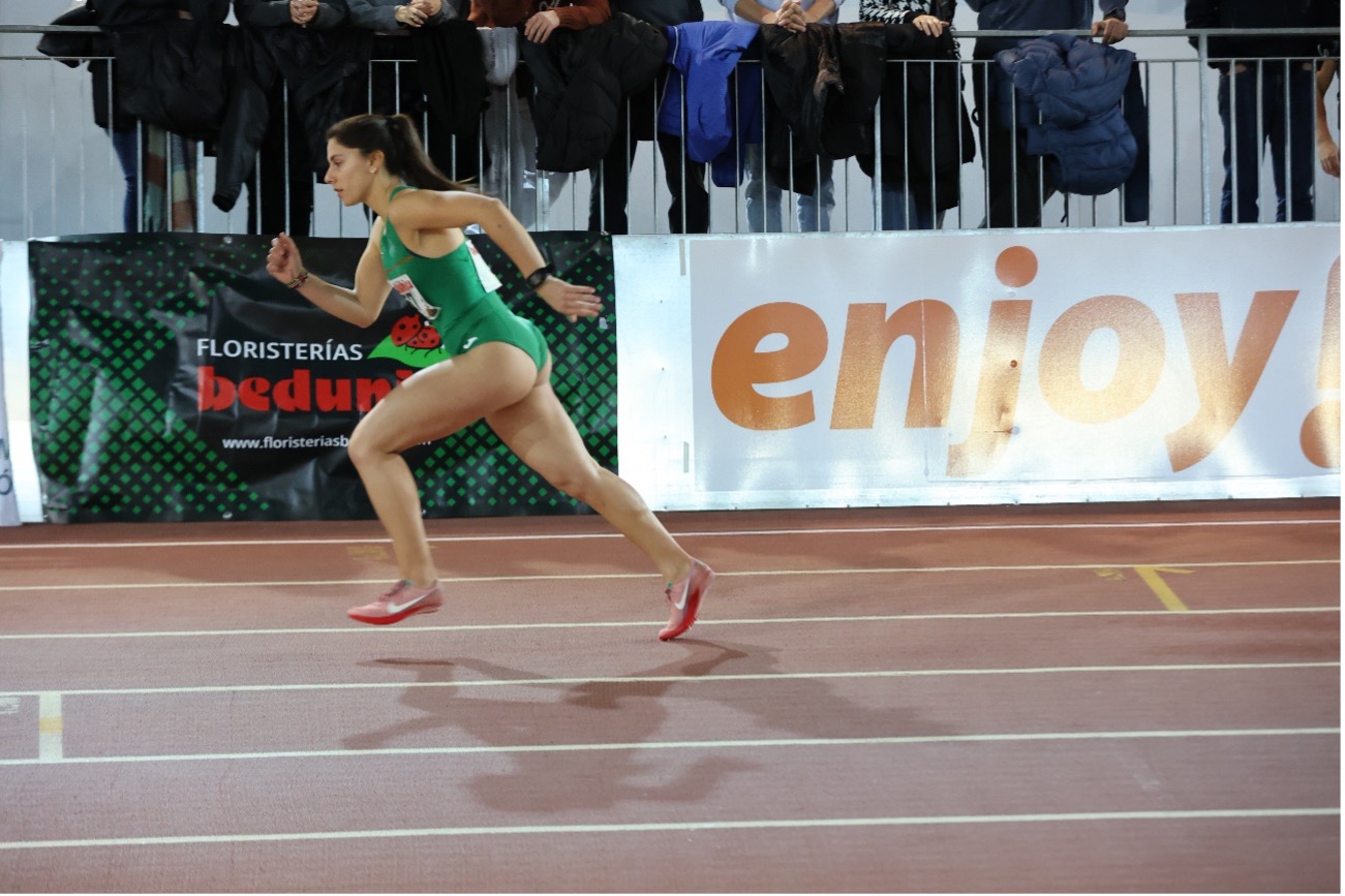 En las pruebas de velocidad, Olga Guerra Castro igualó su marca personal en los 60 m.l. con 7.82 y logró su mejor tiempo de la temporada en los 200 m.l. con 24.97. Por su parte, Andrea Jiménez Hernández completó los 200 m.l. en 25.34 y los 400 m.l. en 56.23.