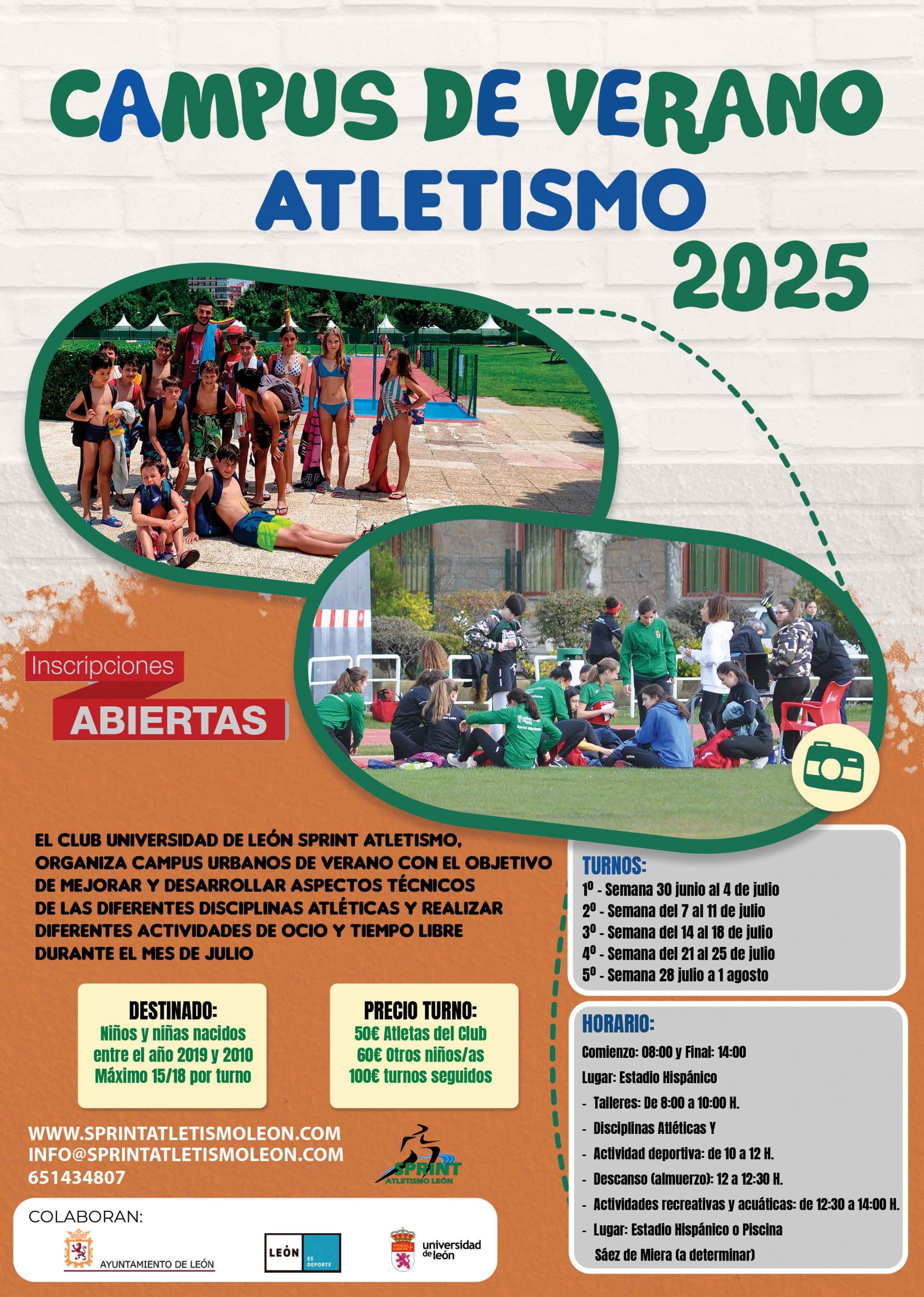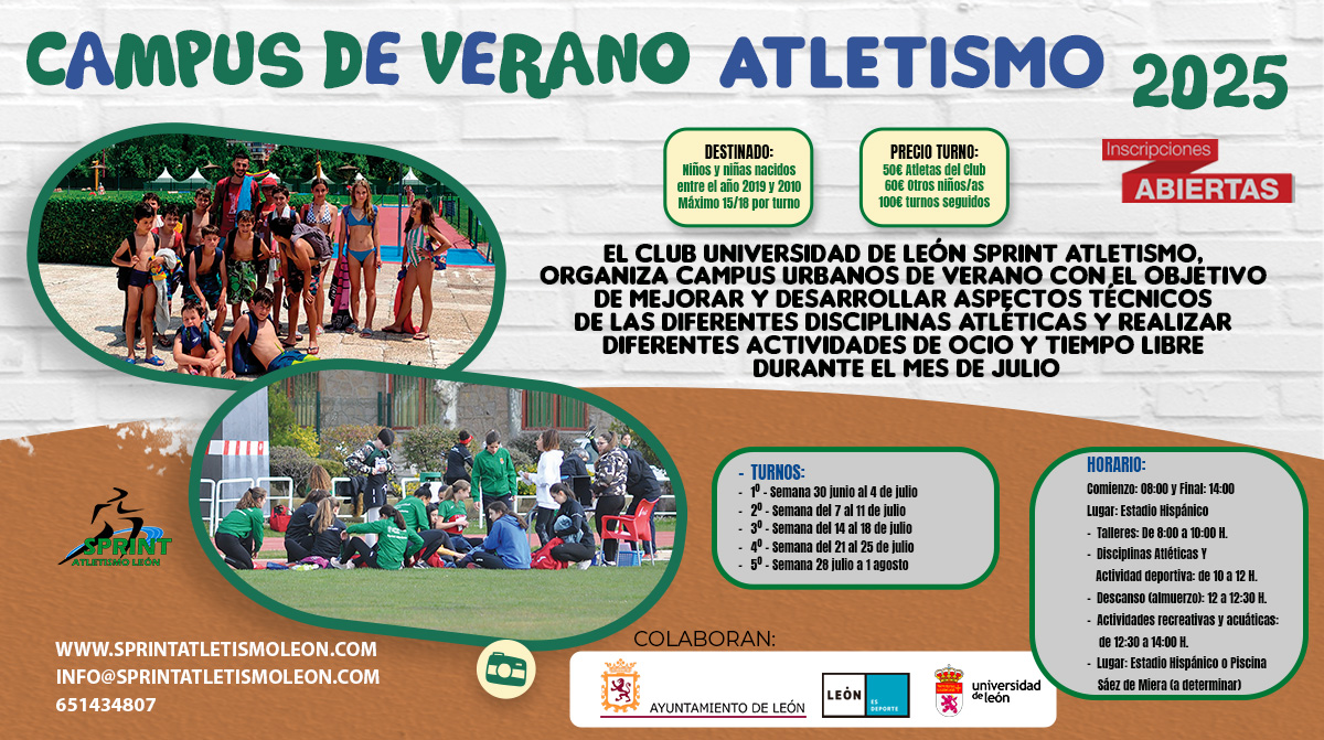 El Club Universidad de León Sprint Atletismo organiza campus urbanos de verano con el objetivo de mejorar y desarrollar aspectos técnicos de las diferentes disciplinas atléticas, combinándolo con actividades de ocio y tiempo libre para que los participantes disfruten de un verano activo, divertido y formativo.