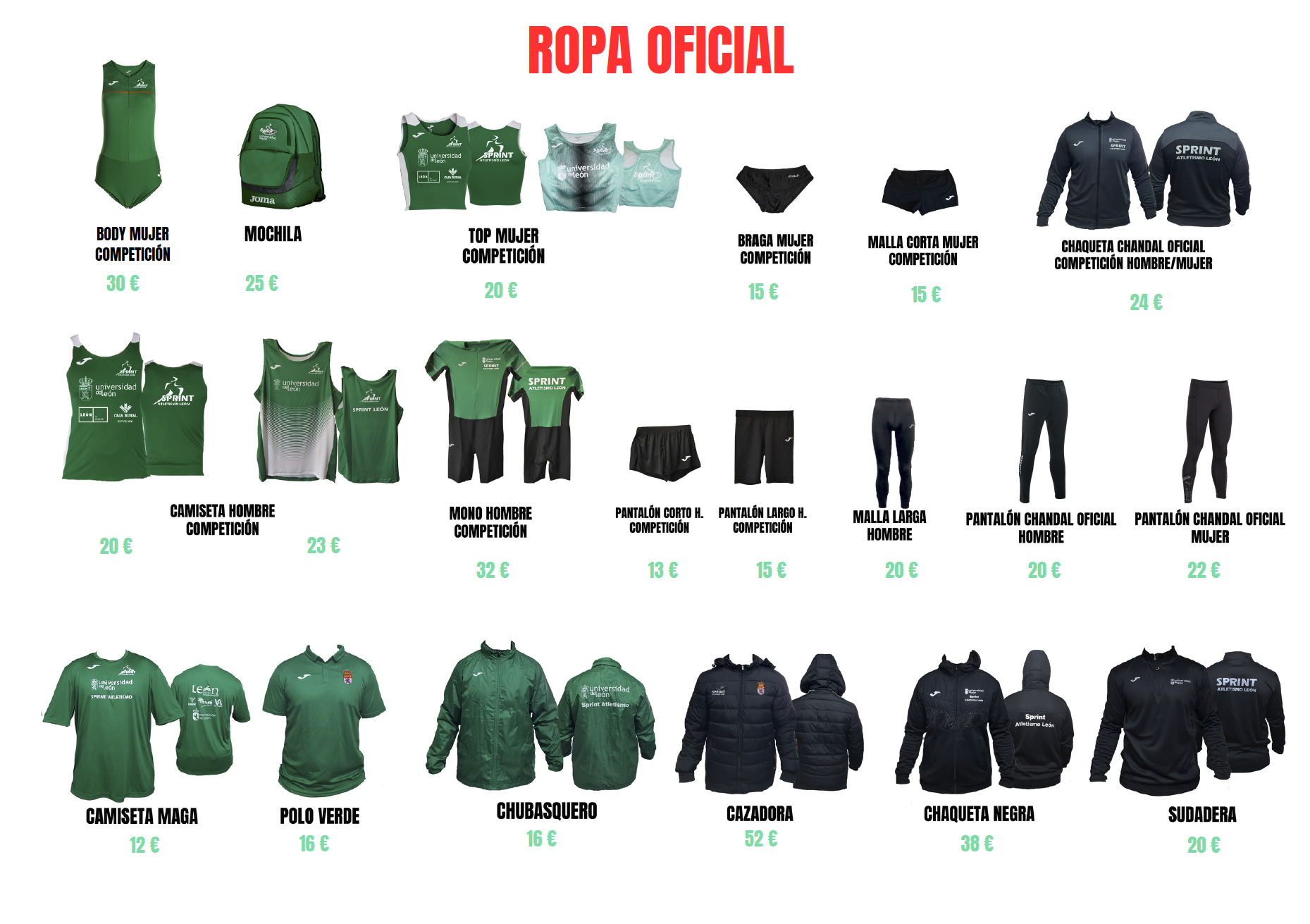 – Se entiende por ropa oficial: Equipación de competición (camiseta, top, body, malla o braga) y prendas complementarias (camiseta de calentamiento, polo, sudadera/chaqueta, chubasquero, mochila y chándal).