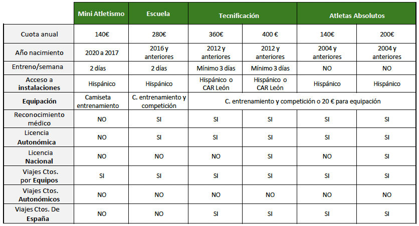 Los atletas de los grupos de tecnificación que deseen participar en competiciones fuera de Castilla y León o que tengan opciones de competir en Campeonatos de España deberán disponer de licencia nacional. Por este motivo, desde el club se recomienda optar por la cuota de mayor importe, que incluye la tramitación de dicha licencia.